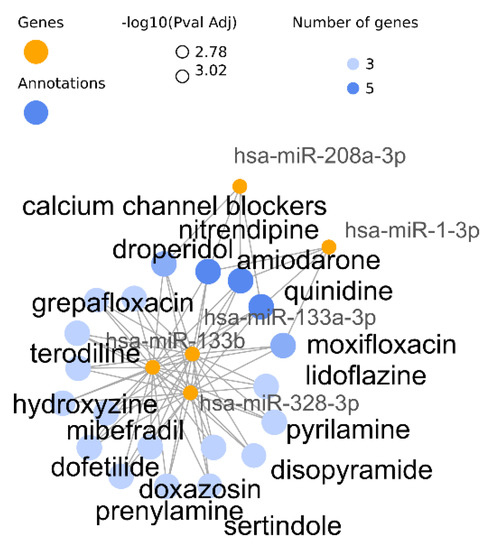 The PharmGKB results with the three available strategies contain antiarrhythmics, such as “quinidine” and “amiodarone” plus calcium channel blockers “nitrendipine” and “felodipine”, although in the hypergeometric test of the target genes no term is found significant. In the target gene approaches, “warfarin”, an anticoagulant drug, is found in the top 20 and not in in the database transformed annotations to miRNAs. In this strategy, however, the top significant drug is the antiarrhythmics “dofetilide” next to the general term “calcium channel blockers” and its derived drug “mibefradil”, “lidoflazine” is HERG K+ channels blocker, and “doxazosin” is used in antihypertensives treatments. Among others, enriched drugs “prenylamine”, “grepafloxacin”, “levomethadyl acetate” or “moxifloxacin” induce heart-related disorders, torsades de pointes and Long QT Syndrome. These results are displayed in the miRNAs-annotation network plot in Figure 3.