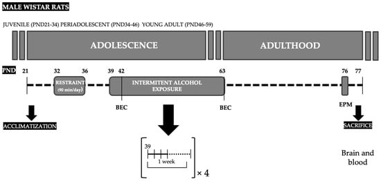 Experimental design of the study. Adolescent male rats were exposed to a repeated restraint stress (90 min/day for 5 consecutive days) from PND32 to PND36 followed by an intermittent alcohol exposure using a binge drinking procedure from PND39 to PND63. Ethanol solution was administered by intragastric gavage at doses of 3 g/kg, 4 days/week for 4 weeks. BEC values were determined 1 h after the alcohol administration at PND42 (last day of first week of alcohol exposure) and PND63 (last day of alcohol exposure). Spontaneous motor activity and anxiety-like behaviors were evaluated 2 weeks after the last administration of alcohol using the EPM. All animals were sacrificed at PND77, and brain and blood samples were collected for determinations. Abbreviations: BEC = blood ethanol concentration; EPM = elevated plus-maze; PND = postnatal day.