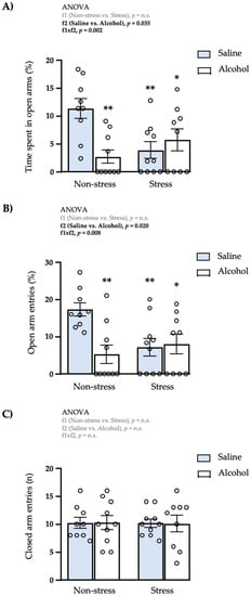 We also evaluated anxiety-like behaviors by the number of entries in the open arms (Figure 2B). Statistical analysis revealed a main effect of adolescent alcohol exposure (f1: F1,34 = 5.98; p = 0.020), and a significant interaction between repeated restraint stress and adolescent alcohol exposure (f1 × f2: F1,34 = 7.85; p = 0.008). Similarly, the post hoc test for multiple comparisons showed a significant decrease in the number of entries into the open arms in all subgroups compared with the non-stress saline subgroup (* q < 0.05 and ** q < 0.01).