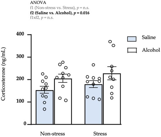 Plasma levels of corticosterone. Corticosterone was determined in male adult rats after repeated restraint stress (f1) and/or intermittent alcohol exposure (f2) during adolescence. Bars represent the mean ± SEM (9–10 rats/subgroup). Data were analyzed by two-way ANOVA. p-value in bold denotes significant main effect of factor 2 (f2).