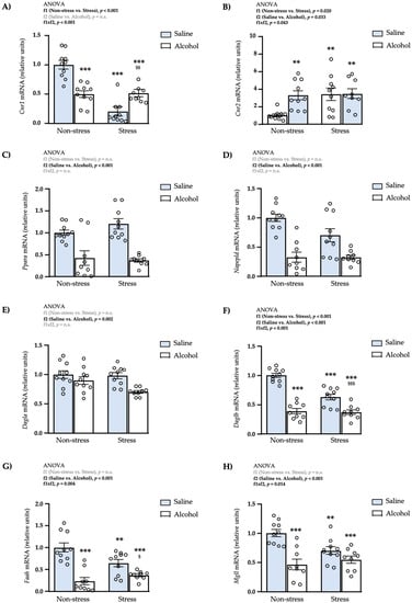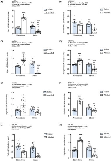 - As shown in Figure 7D, the statistical analysis revealed one main effect of repeated restraint stress on the mRNA levels of Napepld (f1: F1,33 = 41.06; p < 0.001) and a significant interaction between both factors (f1 × f2: F1,33 = 39.01; p < 0.001). The post hoc tests for multiple comparisons showed a significant increase in the expression of Napepld in the non-stress alcohol subgroup compared with the non-stress saline subgroup (*** q < 0.001), and a significant decrease in the stress alcohol subgroup compared with the non-stress saline (*** q < 0.001), non-stress alcohol (### q < 0.001) and stress saline ($$$ q < 0.001) subgroups.