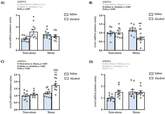 - The statistical analysis revealed one significant main effect of adolescent alcohol exposure (f2: F1,34 = 9.70; p = 0.004) and a significant interaction between both factors (f1 × f2: F1,34 = 10.44; p = 0.003) on the mRNA levels of Grin1 (Figure 5B). The post hoc test for multiple comparisons showed that the stress alcohol group had a significant decrease in the expression of Grin1 compared with the non-stress saline (** q < 0.01), non-stress alcohol (## q < 0.01) and stress saline ($$$ q < 0.001) subgroups.