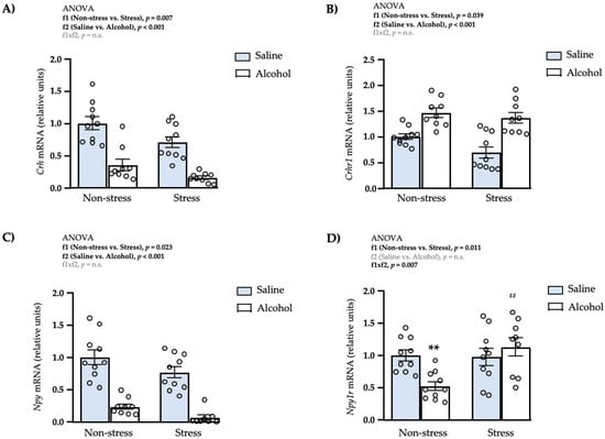 - Regarding its receptor Npy1r, there was a significant main effect of repeated restraint stress (f1: F1,34 = 7.26; p = 0.011) and a significant interaction (f1 × f2: F1,34 = 8.28; p = 0.007) (Figure 6D). The post hoc test for multiple comparisons showed that the non-stress alcohol subgroup had a significant decrease in the expression of Npy1r compared with the non-stress saline (** q < 0.01) and stress alcohol (## q < 0.01) subgroups.
