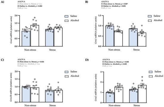 - The statistical analysis revealed significant main effects of repeated restraint stress (f1: F1,33 = 8.15; p = 0.007) and adolescent alcohol exposure (f2: F1,33 = 28.47; p < 0.001) on the mRNA expression of Grin1 (Figure 8B). Thus, rats exposed to restraint stress had significantly lower levels of Grin1 than non-stressed rats, and rats exposed to intermittent alcohol had also significantly lower levels of Grin1 than rats with saline.