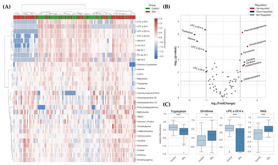 (A) Heatmap for all identified features from plasma of SSc patients (n = 52) and controls (n = 48) was generated based on a selection of the best 30 molecules due to t-tests using clustering method (Distance measure: Euclidean, Algorithm: Ward). (B) p-values and fold change were used for creating a two-dimensional volcano plot of summarized metabolites identified in metabolomics approaches. (C) Box Plots (Box = IQR, whiskers = 1.5 × IQR, horizontal bars = median) of significantly dysregulated metabolites. LPC = lysophosphatidylcholine, PAG = phenylacetylglutamine. p-values were determined using a two-tailed Student’s t-test; p < 0.05 was considered significant (** p < 0.01, *** p < 0.001).