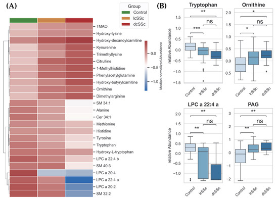 (A) Hierarchical heatmap showing a gradient of metabolites from plasma of control group, patients with limited cutaneous SSc and patients with diffuse cutaneous SSc. Distance measure: Euclidean, Clustering-Algorithm: Ward. (B) Box Plots (Box = IQR, whiskers = 1.5 × IQR, horizontal bars = median) of significantly changed metabolites: tryptophan, ornithine, LPC = lysophosphatidylcholine, and PAG = phenylacetylglutamine. p-values were determined using a two-tailed Student’s t-test; p < 0.05 was considered significant (* p < 0.05, ** p < 0.01, *** p < 0.001, ns: not significant).