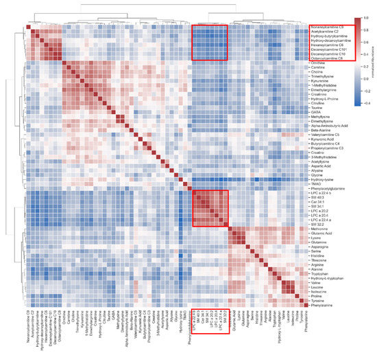 Correlation heatmap showing an interaction of lipids with acyl-carnitines (marked with red squares).