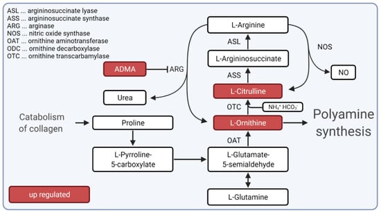 In the case of dimethylarginine, which can influence the urea cycle, two forms are known, namely symmetric dimethylarginine (SDMA) and asymmetric dimethylarginine (ADMA). In our approach, both forms could not be separated chromatographically, and therefore, they are presented as the sum parameter “dimethylarginine”, which was significantly up-regulated. Moreover, citrulline and ornithine, both main mediators in the urea cycle, were significantly up-regulated (see Table 1). Additional statistically significant metabolites are given in Supplementary Table S2.
