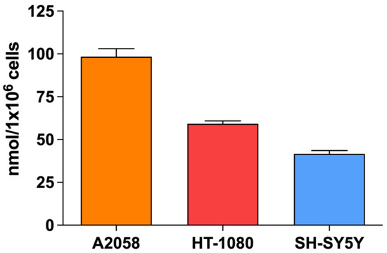 As SDT cytotoxicity is mainly caused by SDT-induced oxidative stress, the basal level of reduced glutathione, considered the dominant intracellular antioxidant system, was determined in all cell lines. Observing Figure 1, the A2058 cell line had the highest GSH concentration (98.35 ± 4.73 nmoL/1 × 106 cells) compared to the HT-1080 cell line (59.20 ± 1.69 nmoL/1 × 106 cells) and the SH-SY5 Y cell line (41.64 ± 1.92 nmol/1 × 106 cells).