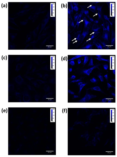 Confocal detection of Ala-derived intracellular PPIX. A2058 (b) and HT-1080 (d) cells were incubated with 0.45 mM Ala for 12 h and 4 h, respectively; SH-SY5 Y (f) cells were incubated with 1.8 mM Ala for 24 h. Panels (a,c,e) represent untreated A2058, HT-1080 and SH-SY5 Y cells, respectively, i.e., cells not incubated with Ala. White arrows indicate the accumulation of PPIX inside melanosomes in A2058 cells. Scale bar: 25 μm.