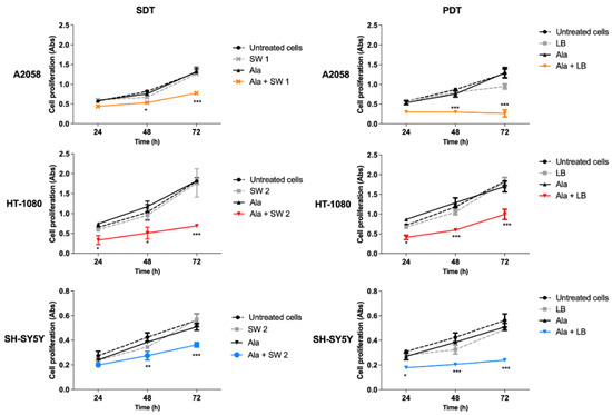 SDT and PDT effects on cell proliferation were observed over time, up to 72 h. In all cell lines, SDT induced the highest decrease of cell proliferation at 72 h after treatment (p < 0.001) compared to untreated cells (Figure 3). In HT-1080 cells, there was a significant SDT-induced decrease in cell proliferation already at 24 h after treatment (p < 0.05). Interestingly, no effect on cell proliferation was observed when all cell lines underwent SW treatment alone. Regarding PDT, a significant decrease in cell proliferation was observed after treatment, already at 24 h in HT-1080 and SH-SY5 Y cells, and at 48 h in A2058 cells, which increased at 72 h (p < 0.001), compared to untreated cells.