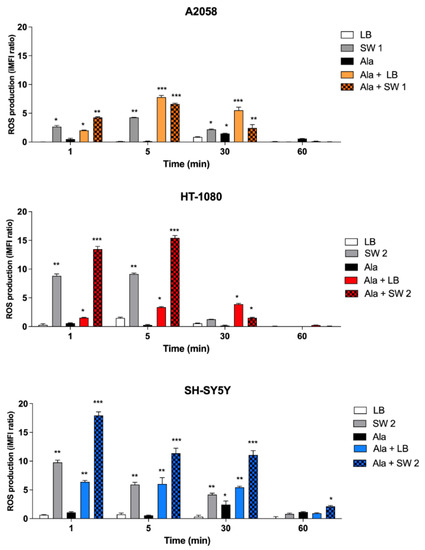 ROS production after SW-mediated SDT and PDT. Untreated cells and cells treated with Ala (0.45 mM for 12 h in A2058 cells, 0.45 mM for 4 h in HT-1080 cells and 1.80 mM for 24 h in SH-SY5 Y cells), shock waves (SW1 0.32 mJ/mm2 for 1000 impulses, 4 impulses/s; SW2 0.43 mJ/mm2 for 500 impulses, 4 impulses/s) or light beams (LB, 15 mW/cm2 for 5 min) and their combination. Statistically significant differences versus untreated cells: * p < 0.05 **, p < 0.01, *** p < 0.001.