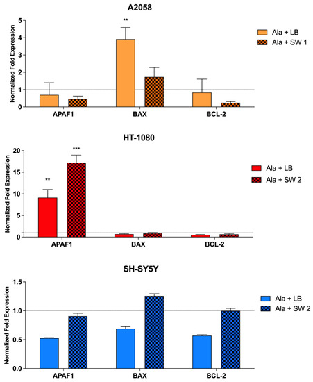 Real-time RT-PCR analysis was performed to explore the effects that sonodynamic and photodynamic treatments have on the mRNA expression of genes involved in apoptosis and in oxidative stress. At 24 h after SDT or PDT treatments, mRNA gene expression was analysed in all cell lines being investigated. As shown in Figure 5, in A2058 cells, a significant up-regulation of the pro-apoptotic BAX gene expression (p < 0.01) was observed after PDT compared to untreated cells, while SDT induced an important down-regulation of anti-apoptotic BCL-2 gene expression compared to untreated cells. In HT-1080 cells, a significant up-regulation of Apoptotic Peptidase Activating Factor 1 (APAF1) after SDT (p < 0.001) and PDT (p < 0.01) compared to untreated cells was observed. In SH-SY5 Y cells, a slight up-regulation of BAX gene expression was observed, which was not statistically significant.