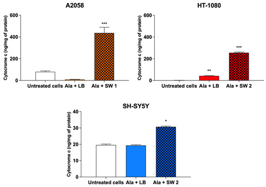 Cytochrome c release after SW-mediated SDT and PDT. Cells were treated with Ala (0.45 mM for 12 h in A2058 cells, 0.45 mM for 4 h in HT-1080 cells and 1.80 mM for 24 h in SH-SY5 Y cells), shock waves (SW1 0.32 mJ/mm2 for 1000 impulses, 4 impulses/s; SW2 0.43 mJ/mm2 for 500 impulses, 4 impulses/s) or light beams (LB, 15 mW/cm2 for 5 min) and their combination. Statistically significant differences versus untreated cells: * p < 0.05, ** p < 0.01, *** p < 0.001.
