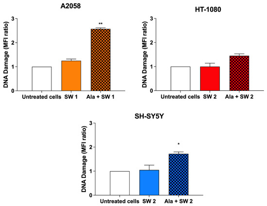 Effect of SW-mediated SDT on DNA damage. Cells were previously incubated with Ala (0.45 mM for 12 h in A2058 cells, 0.45 mM for 4 h in HT-1080 cells and 1.80 mM for 24 h in SH-SY5 Y cells), and then exposed to SW1 (0.32 mJ/mm2 for 1000 impulses, 4 impulses/s) or to SW2 (0.43 mJ/mm2 for 500 impulses, 4 impulses/s). Statistically significant differences versus untreated cells: * p < 0.05, ** p < 0.01.