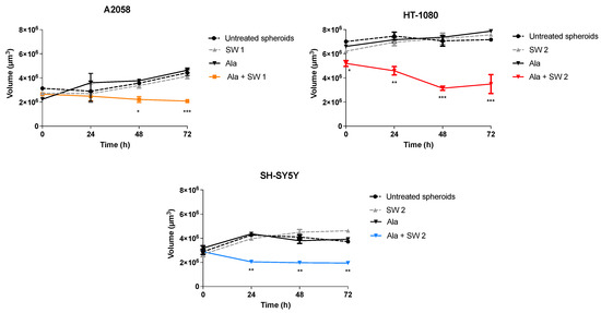 Three-dimensional models have been introduced in the last 20 years to better illustrate cell distribution in space, and they are more representative of the in vivo organisation, with several improvements in viability, morphology and drug metabolism [18]. Therefore, we focused our attention on SDT effects in the studied cells organized in 3D tumour spheroids. The growth of cell spheroid models was performed after SDT by calculating the spheroid volume through phase contrast images at different time points. Analysis of the growth of spheroids treated with SDT showed a significant reduction, compared to untreated spheroids, in the volume of A2058 spheroids after 48 (p < 0.05) and 72 h (p < 0.001); in HT-1080 spheroids after 24 (p < 0.01), 48 (p < 0.001) and 72 h (p < 0.001), and in SH-SY5 Y spheroids after 24, 48 and 72 h (p < 0.01), without loss of spheroid integrity (Figure 8). Moreover, no differences in spheroid growth after Ala or SW treatment alone were observed, compared to untreated spheroids.
