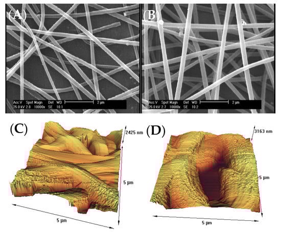 (A) SEM image of untreated gelatin nanofibers, (B) SEM image of atmospheric-air plasma-treated gelatin nanofibers, (C) AFM image of untreated gelatin nanofibers, (D) AFM image of atmospheric-air plasma-treated gelatin nanofibers.
