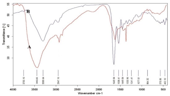 ATR-FTIR spectra of (A) untreated gelatin nanofibers, (B) atmospheric-air plasma-treated gelatin nanofibers.