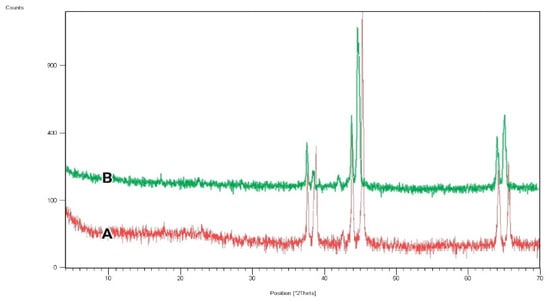 XRD spectra of (A) untreated, (B) atmospheric-air plasma-treated gelatin nanofibers.