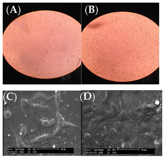 Images of fibroblast cells on gelatin films, (A) inverted optical microscope image from the untreated gelatin film, (B) inverted optical microscope image from the atmospheric-air plasma-treated gelatin film, (C) SEM image from the untreated gelatin film, (D) SEM image from the atmospheric-air plasma-treated gelatin film.