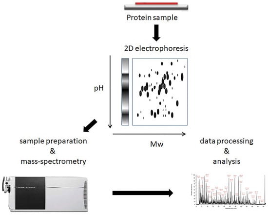 2D-gel electrophoresis followed by mass spectrometry. The experiment starts from electrophoretic separation of protein samples in two directions, by isoelectric point and by molecular weight (Mw). Digestion in- or out-of-gel, mass spectrometry, and data analysis follow electrophoresis.