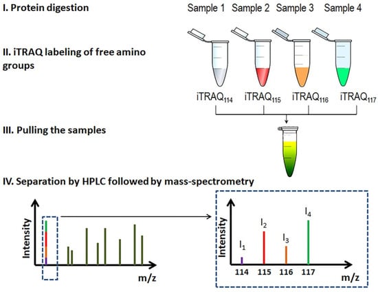 Comparing the proteomes of the stratum corneum, Méhul et al. [] identified ~140 DEPs of lesional and normal-looking skin and proposed some of them to monitor the flow of the disease. They also developed a new technique to assess the efficacy of topical treatments. Briefly, they collected proteins of the stratum corneum using adhesive strips. After extraction, the authors digested the recovered proteins. Then, they labeled the obtained peptides with isobaric tags, iTRAQs (Figure 3) [], separated them by liquid chromatography and analyzed with qTOF mass-spectrometer. For reference, the term qTOF stands for “quadrupole time-of-flight” and refers to a certain way to accelerate ions during mass-spectrometry.