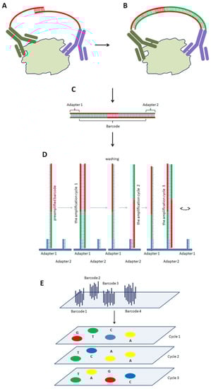 The Proximity Extension Assay. The experiment includes several steps. (A). Immunoassay (Step 1). The pairs of specific antibodies conjugated with ssDNA oligonucleotides specifically interact with target proteins. As both ssDNA contain short complementary sequences, they interact and form a duplex in the middle. (B). Extension of ssDNA (Step 2). The duplex serves as a set of primers to DNA polymerase that extends ssDNA to dsDNA. (C). A cleavage of dsDNA (Step 3). Cutting dsDNA from the antibodies produces an oligonucleotide. Each oligonucleotide contains a unique sequence that serves as a barcode to identify the target protein. It also has two short adapter sequences at the ends. (D). Preparation for the sequencing of the barcodes (Step 4). The obtained double-stranded oligonucleotides are denatured and interact with immobilized probes complementary to the adapters. Then, DNA polymerase amplifies DNA using the probes as primers. (E). Clusterization of DNA and sequencing the barcodes (Step 5). As the concentration of DNA is relatively low, the amplified molecules form clusters. Each cluster originates from a single DNA molecule and represents a specific barcode. As the “clusters” have to be homogenous on their composition, the dsDNA is denatured to wash out the disconnected ssDNA. In addition, DNA attached to the slide through one of the adapters (e.g., adapter 2) becomes cut and removed. The following sequencing of the DNA identifies and quantifies the barcodes. The numbers of identified barcodes are proportional to the levels of the corresponding target proteins since the single interaction of specific antibodies to a target protein produces only one barcode.
