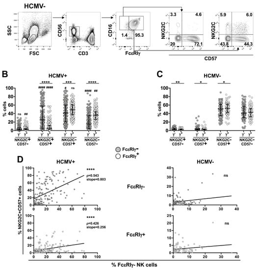 FcεRIγ−NKG2C+CD57+ cells markedly expand in HCMV-seropositive individuals and tightly correlate with individual FcεRIγ− memory pool size. (A) Gating strategy for the identification of peripheral blood FcεRIγ− and FcεRIγ+ CD16+CD56dim NK cell subsets. Numbers represent percentage of gated cells. (B,C) Stratification of CD16+CD56dim NK cells according to NKG2C and CD57 expression, within FcεRIγ− (γ−, grey) and FcεRIγ+ (γ+, empty) cell pools, of 154 HCMV-seropositive (HCMV+) (B) and 75 HCMV-seronegative (HCMV−) (C) healthy individuals. Bars represent median with interquartile range. p values of pairwise comparisons were calculated with Wilcoxon (FcεRIγ− vs. FcεRIγ+) and Mann–Whitney (HCMV+ vs. HCMV−) non-parametric tests. (*) symbol indicates statistical comparison with corresponding FcεRIγ+ subset (FcεRIγ− vs. FcεRIγ+): (*) <0.05, (**) <0.005, (***) < 0.0001, (****) < 0.00001; (#) symbol indicates statistical comparison with corresponding subset of HCMV− donors (HCMV+ vs. HCMV−): (#) < 0.05, (##) < 0.005, (####) < 1 × 10−7. (D) Correlation between the percentage of FcεRIγ−NKG2C+CD57+ (grey, upper panels) or FcεRIγ+NKG2C+CD57+ (white, lower panels) subsets with the size of the FcεRIγ− memory NK cell pool in HCMV+ (left panels) and HCMV− (right panels) individuals. Spearman’s correlation coefficients (r) and curve slopes are reported when 2-tailed p values were significant (<0.05): (****) < 1 × 10−7.