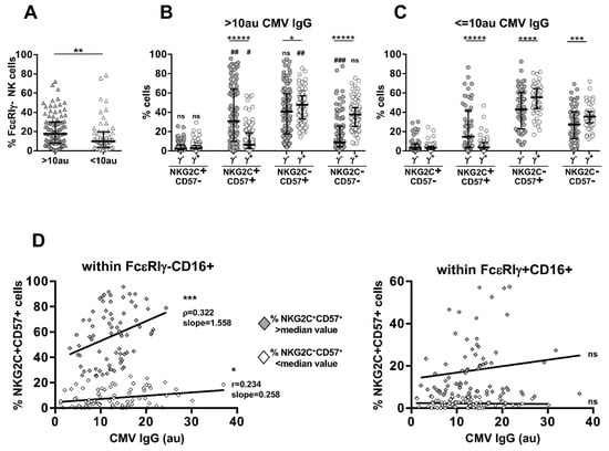Anti-HCMV IgG levels impact FcεRIγ− memory NK cell pool abundance and correlate with the expansion of FcεRIγ−NKG2C+CD57+ subset in seropositive individuals. (A) Percentage of FcεRIγ− memory (within CD16+CD56dim) NK cells in HCMV+ healthy donors stratified for higher (>10 arbitrary units, au, grey triangles) or lower (≤10 au, empty triangles) levels of anti-HCMV antibodies. Relative percentage of FcεRIγ− (γ−, grey circles) and FcεRIγ+ (γ+, empty circles) subsets in individuals with >10 au (B) or ≤10 au (C) anti-HCMV antibodies. Bars represent median with interquartile range. p values of pairwise comparisons were calculated with Wilcoxon and Mann–Whitney (>10 au vs. ≤10 au) non-parametric tests, as appropriate. (*) symbol indicates statistical comparison with corresponding FcεRIγ+ subset (FcεRIγ− vs. FcεRIγ+): (*) < 0.05, (**) = 0.01, (***) < 0.005, (****) < 0.001, (*****) < 0.00001; (#) symbol indicates statistical comparison with corresponding subset of individuals producing lower levels of anti-HCMV antibodies (>10 au vs. ≤10 au): (#) < 0.05, (##) < 0.01, (###) < 0.0005. (D) Correlation between the relative abundance of FcεRIγ− (left panel) or FcεRIγ+ (right panel) NKG2C+CD57+ cells and anti-HCMV antibody concentration. Individuals possessing a larger (higher the median value, grey diamonds) or smaller (lower than median value, empty diamonds) given subset were analysed separately. Spearman’s correlation coefficients (r) and curve slopes are reported when 2-tailed p values were significant (<0.05): (*) < 0.05, (***) < 0.005.