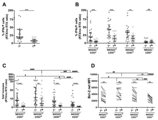 Antibody-induced expansion reflects a balance between CD16-induced proliferation and apoptosis [21,22,23]. FcεRIγ− and/or NKG2C+ NK cells have been shown to express higher levels of the Bcl-2 anti-apoptotic molecule [8,12]. Here, we show that, with the exception of the NKG2C+CD57+ subset, all FcεRIγ− subsets display a higher expression of Bcl-2, as compared to their respective FcεRIγ+ counterparts (Figure 3D). Of note, FcεRIγ− and FcεRIγ+ NKG2C+CD57+ cells displayed comparable Bcl-2 content that were tendentially highest.