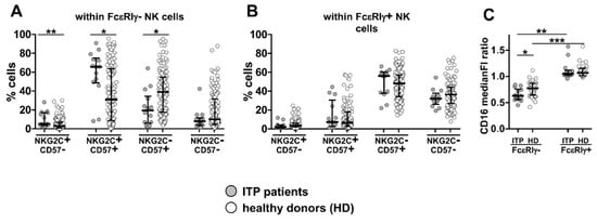 Altered memory NK subset profile in ITP patients. Percentage of FcεRIγ− (A) and FcεRIγ+ (B) CD16+CD56dim NK cell subsets in a cohort of 14 ITP patients (grey) and 121 HCMV+ healthy individuals (empty), both under 65 years of age, and with a sizeable FcεRIγ− memory pool (>5% of total NK cells). Bars represent median with interquartile range. p values of pairwise comparisons were calculated by Mann–Whitney non-parametric test and reported when significant (<0.05): (*) p = 0.01, (**) p < 0.005. (C) CD16 surface levels were evaluated in 14 ITP patients (grey) and 31 age- and sex-matched HCMV+ healthy individuals (empty) and expressed as median fluorescence intensity (medianFI) ratio of FcεRIγ− or FcεRIγ+ populations vs. medianFI of CD56dim NK cells. Bars represent median with interquartile range. p values of pairwise comparisons were calculated by Mann–Whitney and Wilcoxon non-parametric tests, as appropriate, and reported when significant (<0.05): (*) p < 0.05, (**) p < 0.001, (***) p < 0.0001.