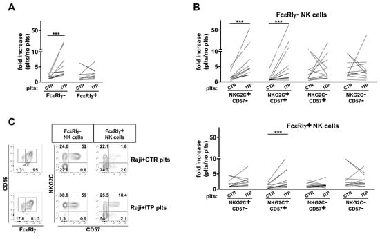 In line with previous reports, FcεRIγ− cells were characterized by a lower CD16 expression than FcεRIγ+ NK cells in both ITP patients and controls (Figure 4C) [7,24]. Relevantly, the observation that CD16 receptor was further significatively downregulated in FcεRIγ− NK cells of ITP patients is suggestive of an efficient chronic contact with antibody-opsonized cells in vivo (Figure 4C).