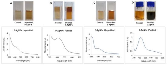 UV-Vis spectra and visible analysis of P-AgNPs and E-AgNPs formation before and after purification of nanoparticles. P-AgNPs unpurified nanoparticles visible and UV-vis spectrum (A), purified nanoparticles (B). E-AgNPs unpurified nanoparticles visible and UV-vis spectrum (C), purified nanoparticles (D). Control refer to the visible image of supernatant under similar conditions and without bacteria.