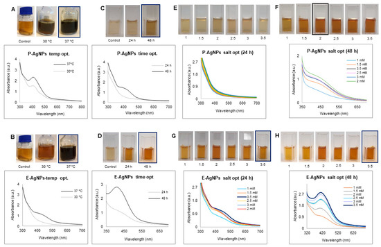 Optimization studies for P-AgNPs and E-AgNPs production. For P-AgNPs, visible picture and UV-Vis spectrum (A) temperature optimization, (C) time optimization, and (E,F) silver salt optimization at 24 h and 48 h. For E-AgNPs, visible picture and UV-Vis spectrum (B) temperature optimization, (D) time optimization, and (G,H) silver salt optimization at 24 h and 48 h.
