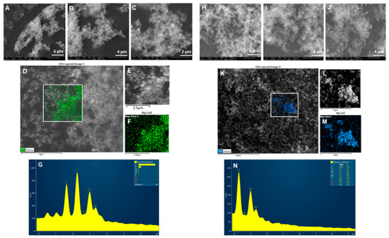SEM, elemental mapping, and EDX analysis of P-AgNPs and E-AgNPs. For P-AgNPs, (A–C) SEM images of nanoparticles at different scales, (D–F) Elemental mapping showing scanned image of NPs with silver element distribution (green), (G) EDX spectrum of the elemental mapped region showing sharp peak for silver element. For E-AgNPs, (H–J) SEM images of nanoparticles at different scales, (K–M) Elemental mapping showing scanned image of NPs with silver element distribution (blue), (N) EDX spectrum of the elemental mapped region showing sharp peak for silver element.