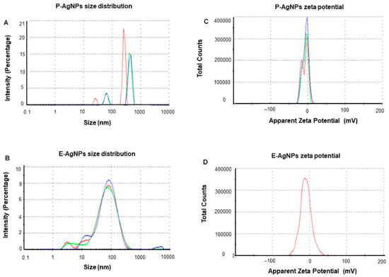 DLS measurements were carried out to determine the average hydrodynamic diameter and the zeta potential of the NPs. The results displayed the size distribution concerning the intensity of nanoparticles with a polydispersity index (PDI), which correlates with their stability. The higher the PDI value is, the less monodispersed the nanoparticles are. For P-AgNPs, the size distribution was 108 nm with PDI 0.732 (Figure 6A), and for E-AgNPs, the size from DLS measured was 47.2 nm with PDI value 0.509 (Figure 6B). Both PDI values appear to be quite small, which means that the nanoparticles were mostly monodisperse. The zeta potential values observed for P-AgNPs and E-AgNPs were −6.12 mV (Figure 6C) and −18.7 mV (Figure 6D), respectively. The negative zeta potential value further confirms the stability of nanoparticles in aqueous solutions [25]. Based on the results, E-AgNPs appear to be more stable than P-AgNPs due to the high negative zeta potential value.