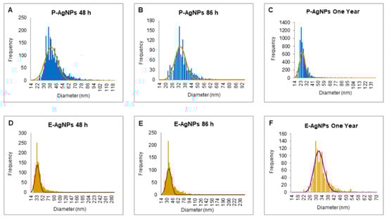 sp-ICPMS and stability analysis of P-AgNPs and E-AgNPs. ICPMS histogram of P-AgNPs at different time intervals, (A) after 48 h of synthesis at RT (room temperature), (B) after 86 h of synthesis at RT, (C) after one year at 4 °C. ICPMS histogram of E-AgNPs at different time intervals, (D) after 48 h of synthesis at RT, (E) after 86 h of synthesis at RT, (F) after one year at 4 °C.