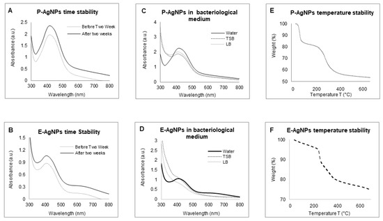 UV-Vis spectrum representing the stability analysis, before and after two weeks of incubation at RT for (A) P-AgNPs, and (B) E-AgNPs; in a different medium, (C) P-AgNPs, (D) E-AgNPs; at the temperature range from 20–700 °C measured by TGA instrument, (E) E-AgNPs, (F) E-AgNPs.