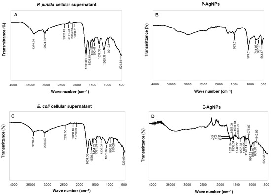 FTIR spectrum of (A) freeze-dried cellular supernatant of P. putida and (C) E. coli, and (B) pure P-AgNPs, and (D) E-AgNPs, which demonstrate the active surface groups for respective samples.