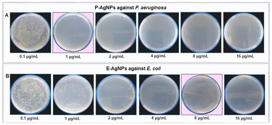 Cell viability test at different concentrations ranging from 0.1–16 µg/mL of (A) P-AgNPs against P. aeruginosa and (B) E-AgNPs against E. coli. The pink background shows the MBC values of respective pathogens with complete growth inhibition.