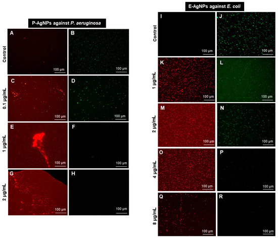 Live and dead staining. (A–H) P-AgNPs effects on P. aeruginosa and (I–R) E-AgNPs effects on E. coli.
