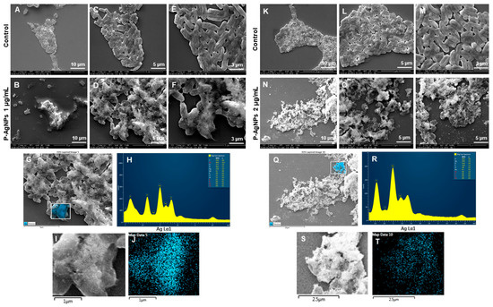 SEM analysis of P. aeruginosa cells after treatment with P-AgNPs. (A–E) Control cells and (B–F) P-AgNPs treated cells with 1 µg/mL at different scales. (G) Scanned image of treated cells, (H) EDX spectrum of the chosen area-showing peak for silver element. (I,J) elemental mapping of the selected area showing silver elements in the treated cells (blue color). (K–M) Control cells and (N–P) cells treated with 2 µg/mL of P-AgNPs at different scales. (Q) Scanned image of treated cells, (R) EDX spectrum of the chosen area showing peak for silver element, (S,T) elemental mapping of the selected area showing silver elements in the treated cells (blue color).