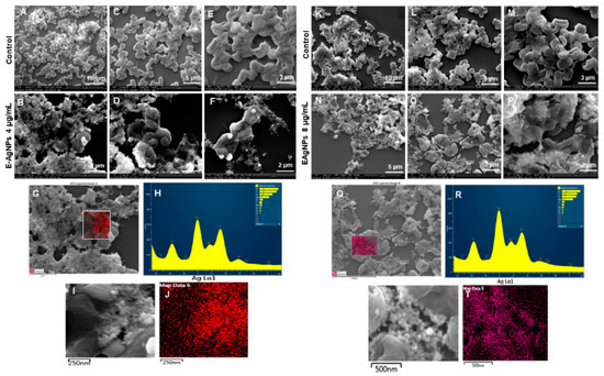 SEM analysis of E. coli cells after treatment with E-AgNPs. (A–E) Control cells and (B–F) cells treated with 4 µg/mL of E-AgNPs at different scales. (G) Scanned image of treated cells, (H) EDX spectrum of the chosen area-showing peak for silver element. (I,J) Elemental mapping of the selected area showing silver elements in the treated cells (red color). (K–M) Control cells and (N–P) cells treated with 8 µg/mL of E-AgNPs at different scales. (Q) Scanned image of treated cells, (R) EDX spectrum of the chosen area showing peak for silver element, (S,T) elemental mapping of the selected area showing silver elements in the treated cells (pink color).