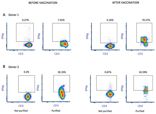 A total of 1 × 109 leukocytes were used to purify and enrich M-protein SARS-CoV-2-specific T-cells from both donors before and after vaccination. Enrichment of IFNγ+ CD3+ T-cells in the final product was analyzed by flow cytometry for donor 1 (A) and donor 2 (B). Percentage of enrichment was quantified by establishing the quality control before purification as baseline (not purified).