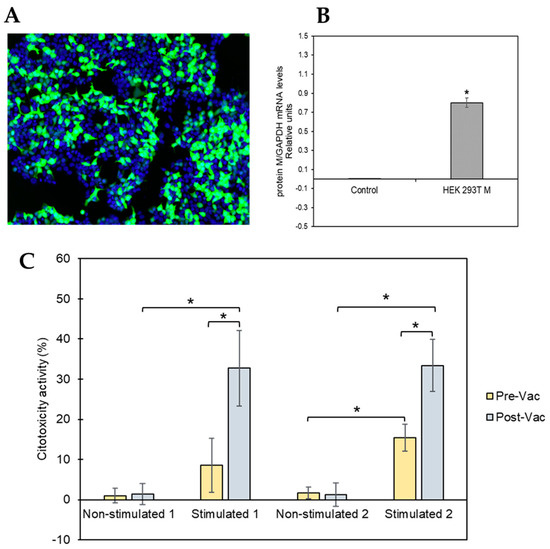 HEK 293Tcell model to test M-protein-mediated specific cytotoxicity activity. (A) Representative image of the transfected cells. Nuclei are shown in blue (Hoechst 33342), while transfected cells are visible in green (GFP). (B) Expression levels of SARS-CoV-2 mRNA for M protein were measured 48 h post-transfection of HEK 293T cells using RT-qPCR. The obtained results were normalized to the mRNA levels of the constitutive gene GAPDH. The asterisk (*) indicates that levels of SARS-CoV-2 mRNA for M protein were significantly higher (p-value ≤ 0.05, tailed t-student test) in HEK 293T cells transfected with the plasmid pcDNATM3.1/myc-His containing the M protein coding gene than the levels obtained after transfecting the HEK 293T cells with the control plasmid (pcDNATM3.1). (C) Percentage of cytotoxic activity of the stimulated and non-stimulated T-cells against M protein of SARS-CoV-2 expressed in HEK 293Tcells in the membrane. T-cells isolated from two convalescent donors before and after vaccination were isolated for the cytotoxicity assay. All the experiments were performed at least in triplicate at both time points (before and after vaccination).