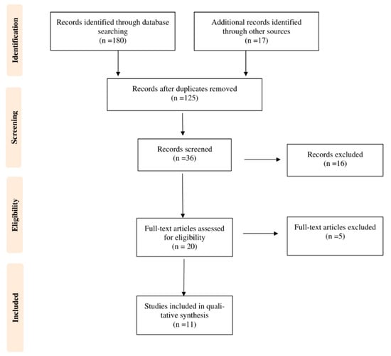 The first systematic search of the literature yielded 180 entries. After excluding duplicates, 125 were classified as potentially relevant and selected for title and abstract analysis. Then, 16 were excluded due to not meeting the characteristics of the approach or the review goal. After reviewing the full text of the remaining 36 records, only 11 met the inclusion criterion of age and were included in the final qualitative analysis [33,34,35,36,37,38,39,40,41,42,43]. Figure 1 illustrates the number of studies at each level of the review using the Preferred Reporting Items for Systematic Reviews and Meta-analyses (PRISMA) flow chart. The final study base included 11 articles reporting on five different types of carotenoids.
