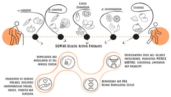 Among the micronutrients and bioactive compounds introduced in the diet, carotenoids are a group of phytochemicals found abundantly in deep green, yellow, orange, or red fruits and vegetables [23]. Among more than seven hundred structurally defined carotenoids identified in nature, five major elements have been found in human serum, namely α-carotene, β-carotene, lutein, lycopene, and β-cryptoxanthin, that are deemed essential in human nutrition [24].