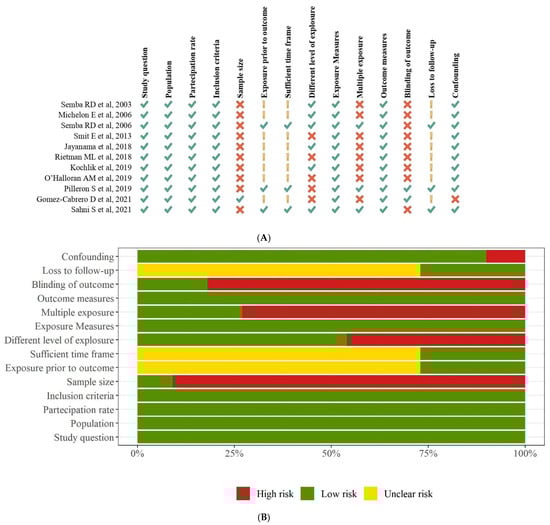 Quality assessment findings using the National Institutes of Health Quality Assessment Toolkits for Observational Cohort and Cross-Sectional Studies. Panel (A). Summary of risk of bias. Panel (B). Risk of bias graph.