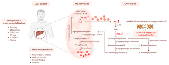 AIP is caused by genetic mutations affecting PBGD activity with the consequent depletion of heme production in the liver. The main consequence of the shutdown of heme biosynthesis is the loss of negative feedback on ALAS1, which leads to the overproduction and accumulation of the porphyrin precursors ALA and PBG in the liver and systemic circulation. The excess of ALA is the major trigger of neurological damage by inducing autonomic and peripheral neuropathy and also encephalopathy. Due to its structural similarity with the γ-aminobutyric acid (GABA) and glutamate neurotransmitters, ALA may modify the GABAergic system by acting as a GABA-receptor agonist and by inhibiting GABA release from the pre-synaptic terminals [6,32]. Moreover, ALA participates in the production of free radicals and reactive oxygen species (ROS) and may promote hepatic ROS-induced genomic and mitochondrial DNA damage (mtDNA) that predisposes patients with AIP to a higher risk of developing hepatocellular carcinoma (HCC) [33,34,35]. Although it has been broadly established that the symptoms of acute attacks are mainly attributed to the accumulation of neurotoxic metabolites, there is no conclusive evidence to date about the factors influencing penetrance and the wide variability in clinical manifestations. Indeed, ~90% of patients with AIP, many of whom are asymptomatic, high excreters (ASHE) of porphyrins, remain asymptomatic throughout their life, suggesting that the pathophysiology of acute events may not be directly triggered by the accumulation of neurotoxic byproducts.