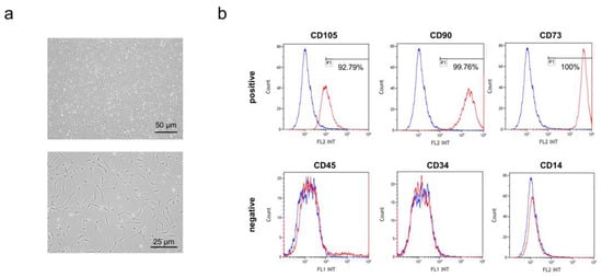 hEpi AD–MSCs were isolated from human epidural fat tissue during posterior decompression surgery of the lumbar spine []. According to the criteria for identifying MSCs set by the International Society for Cellular Therapy (ISCT), MSCs adhere to plastic and express specific cell surface markers. The isolated hEpi AD–MSCs were cultured in plastic cell culture dishes and adhered to the bottom of a spindle-shaped morphology (Figure 1a). In addition, hEpi AD–MSCs expressed surface markers CD105, CD73, and CD90, but they did not express CD45, CD34, and CD14 (Figure 1b). hEpi AD–MSCs were cultured until passage 5 to passage 10 to isolate their exosomes from the culture medium.
